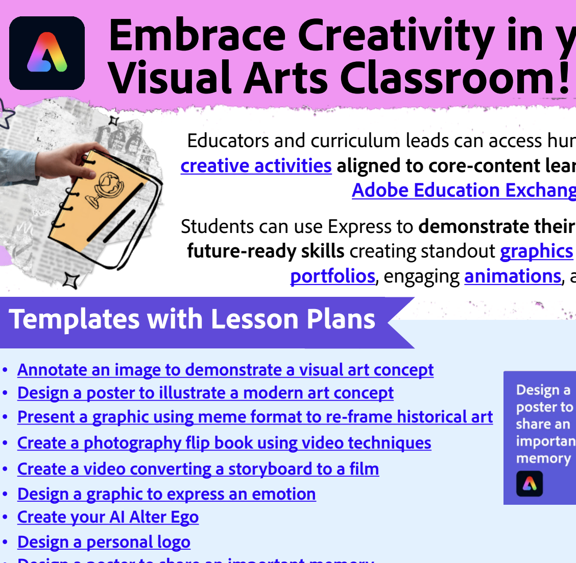VISUAL ARTS RESOURCES · VISUAL ARTS RESOURCES · VISUAL ARTS RESOURCES · Click on the resources below to discover lesson plans, templates, and creative project ideas you can implement in your visual arts classroom right away! Writing: Storyboard with a Comic Strip Culture/Community: Digital Self Portraits Culture/Community: Creative Identity (with walkthrough!) Shareable Resources